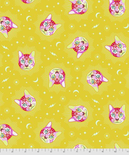 There is a lot to discover in this collection and everything has meaning from the original story. Alice falls down the rabbit hole surrounded by curious objects in “Down the Rabbit Hole”. When Alice first gets to the bottom of the Rabbit Hole she grows so tall that she can’t fit through the door to Wonderland and she begins to cry. As she shrinks, her tears flood out the little door taking her and many Wonderland residents with the current in a print called “Sea of Tears”. The “Cheshire” cat looms in the night sky watching over Wonderland. Painted, spotted roses still dripping with wet paint sit on a background of oversize spots just hoping to blend in and escape the Queen’s notice. A wide stripe of vines grow out of the selvage scooping up a Mad Hatter’s tea party. There is so much more to discover.