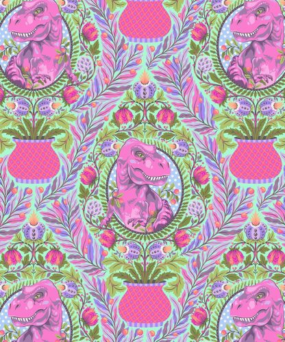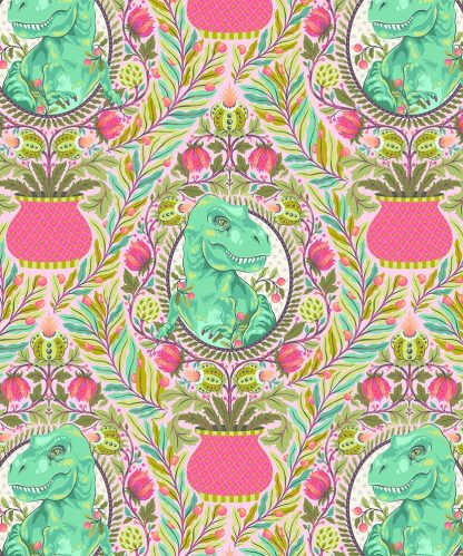 Everything that I do as a fabric designer is about indulging my childhood fantasies. I try to hold on to all of the things that we so easily let go of as we grow up like wonder, amazement, creative logic and delight. Typically, dinosaur fabrics are for children and I don't know who made that decision but I wildly disagree. Roar! is whimsical take on fancy dinosaurs for those of us who keep one foot firmly planted in fantasy. My prehistoric landscape is drenched in details and color. Here you will find a sophisticated T-Rex in a topiary, A Triceratops out for a stroll on a windy parkway path, Happy little hidden Raptors in a dainty damask and Pterodactyls taking time to smell the flowers. It's just your average lazy afternoon in the garden with the giants of Earth's history.